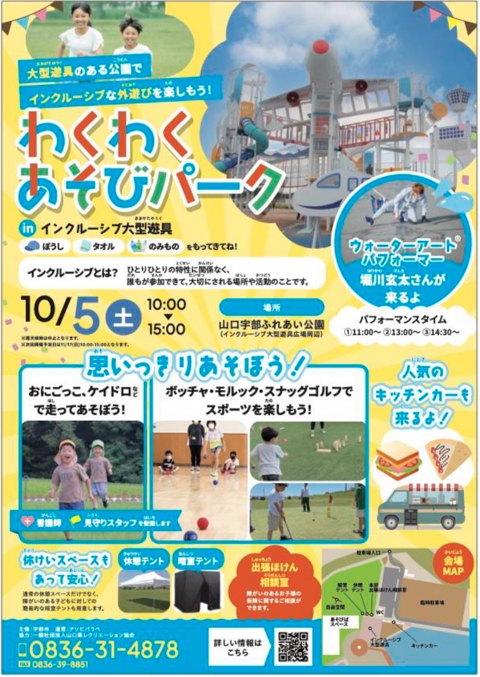 2024.10.18 お知らせ 宇部市「わくわくあそびパーク」に参加しました! 障がいのあるお子さまの保険に関する相談ができる、「出張ほけん相談室」として参加しました。11月に第2弾が開催予定なので、ご興味のある方は是非ご来場ください!
