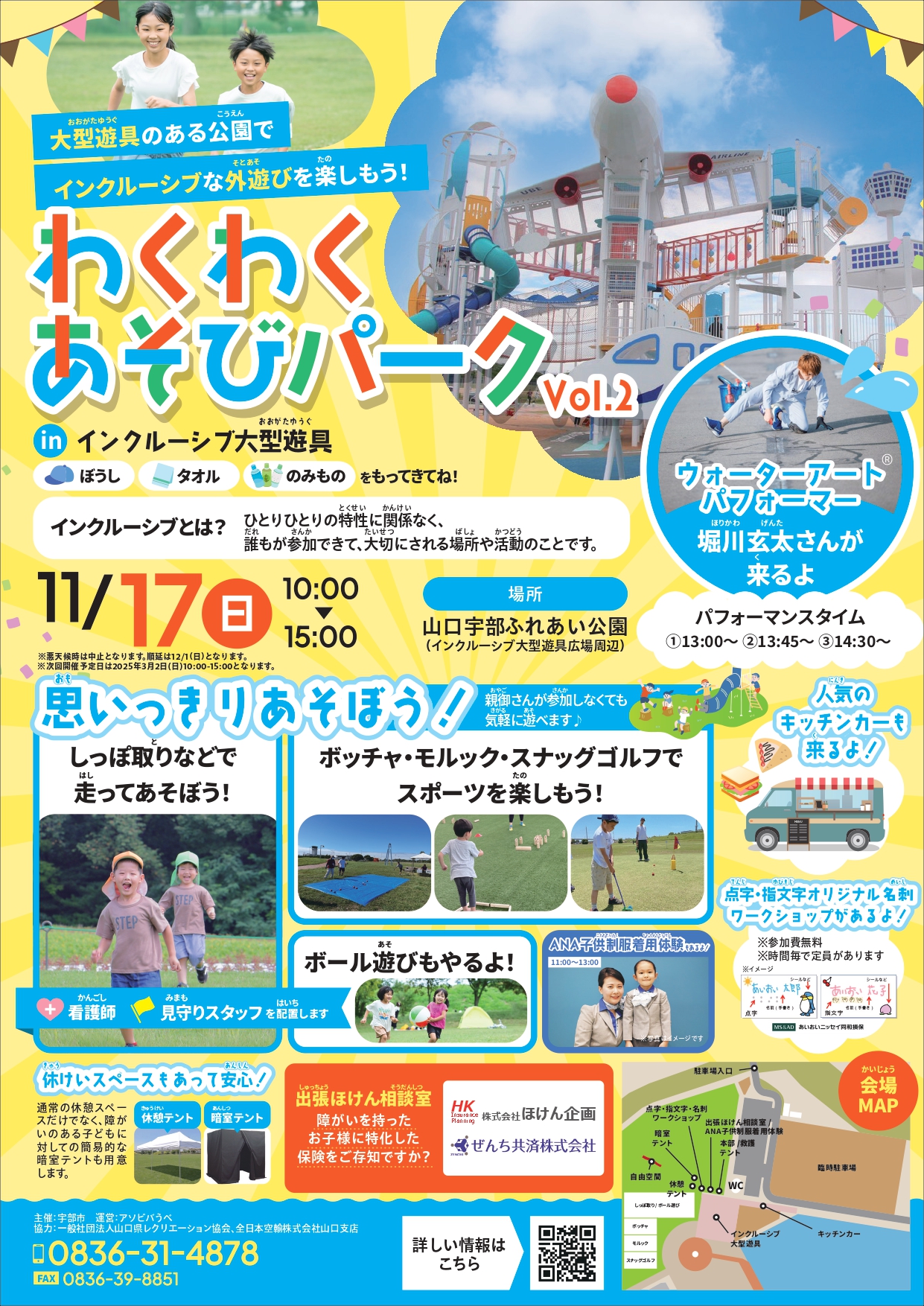 2024.11.12 お知らせ 宇部市「わくわくあそびパークVol.2」が開催されます 宇部市「わくわくあそびパークVol.2」が11月17日の日曜日に開催されます。今回も障がいを持ったお子様に特化した保険の相談ができる「出張ほけん相談室」として参加いたします!その他いろいろな体験ができるイベントも企画されていますので、ご興味のある方は是非ご来場をお待ちしております。